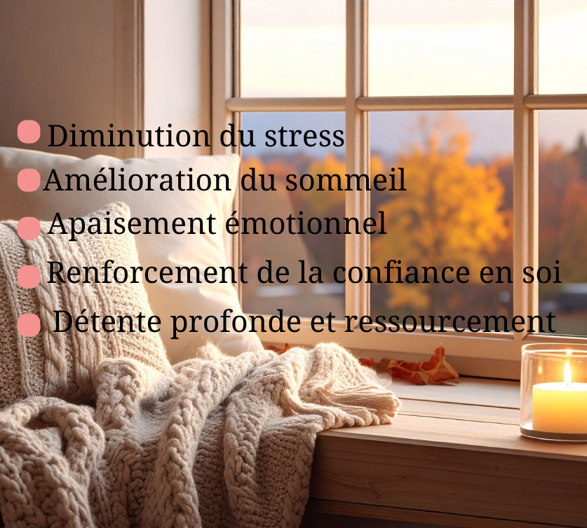 Chaque personne arrive avec son histoire, ses émotions, ses besoins. Lors de la séance, je prends le temps d'écouter ce que vous vivez, stress, fatigue mentale, difficultés de sommeil, manque de confiance, hypersensibilité, surcharge émotionnelle. Je vous accompagne en visio, dans un cadre sécurisant, bienveillant dans votre environnement familier .